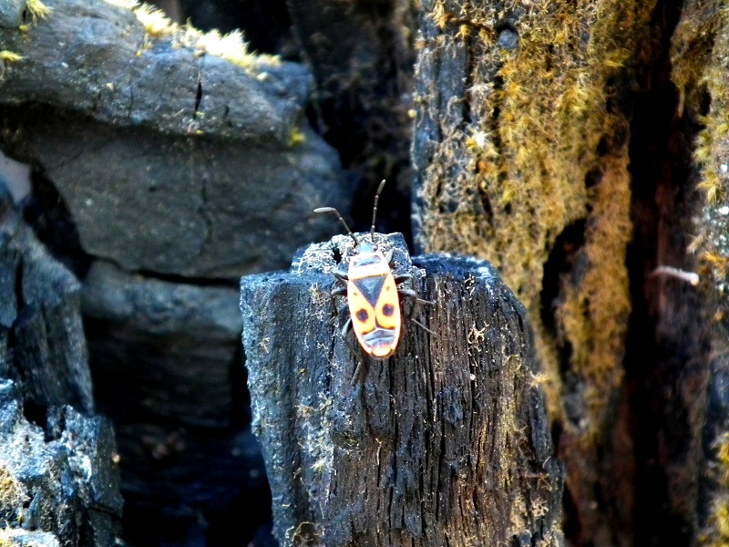 Hoje cheguei à sua identificação, trata-se de um Pyrrhocoris apterus, e pelo que pesquisei não encontrei nenhum nome em português além de... percevejo! Mas como percevejos há muitos, para mim passará a ser o percevejo Inca!