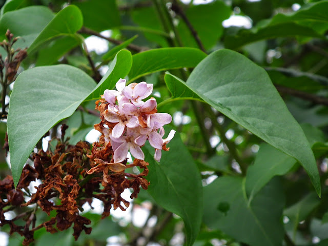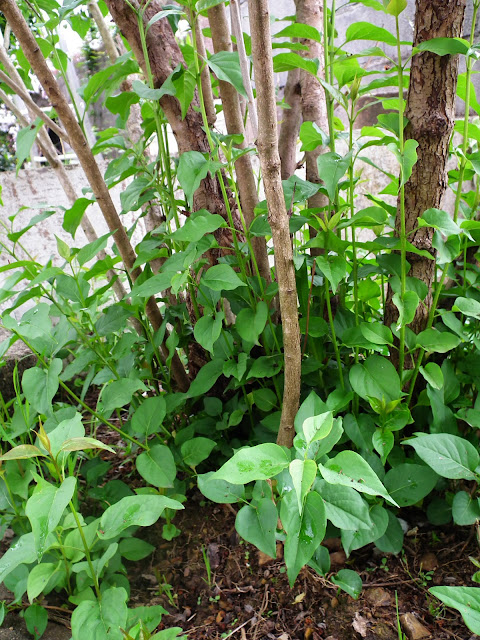 Só que excluindo as semanas em que temos a floração, temos um arbusto mais ou menos ereto, e eu até nem lhe acho particular graça e ainda por cima é extremamente invasivo, pois das raízes em volta do tronco nascem novos rebentos a uma distância considerável. Hoje, ao passar por ele, vi que as últimas flores já estão a secar, e no solo, dezenas de novos rebentos irrompem.