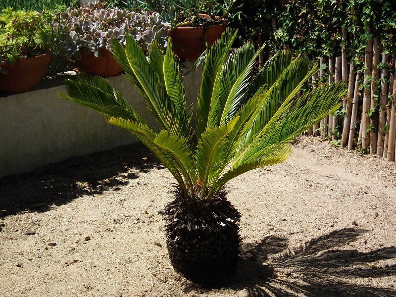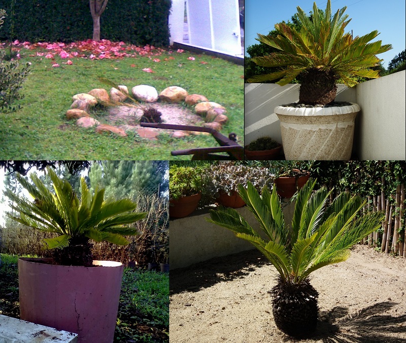 Este espaço levou uma quantidade substancial de areia, eu diria que talvez uns dez ou quinze centímetros de altura. E as cycas gostam precisamente de um solo arenoso, com boa drenagem e com alguma matéria orgânica, que coloquei aquando da plantação e acrescentar que, uma vez que tenho ali mesmo ao lado o lago das tartarugas, aproveito essa água para a regar.