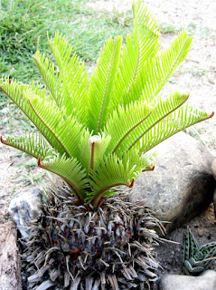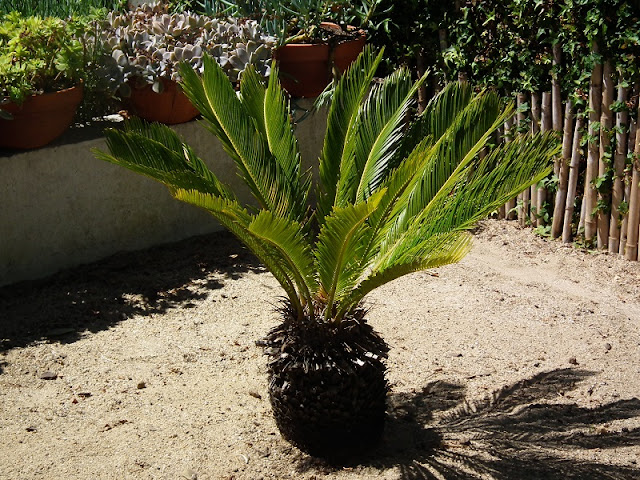 Mas visto que a minha cyca estava muito preguiçosa (claro que a planta é que sabe quando deve emitir novas folhas) mas uma vez que há dois anos não dava quaisquer folhas novas, decidi aplicar-lhe um tratamento de choque e tirar-lhe todas as folhas que tinha. E as folhas da cyca não se podam com uma tesoura da poda, aliás, como eu já tinha feito anteriormente. Não, é mais simples, rápido e esteticamente mais bonito, simplesmente puxamos a folha que ela sai muito facilmente e não deixa ali aquela ponta da folha cortada, como se pode ver na planta que tenho.