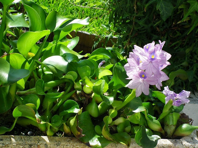 Uma das plantas de que sou adepto é o Aguapé ou Jacinto-de-água (Eichhornia crassipes) como é conhecido por cá, planta proibida em Portugal já do tempo da ditadura. Trata-se de uma planta brasileira oriunda do rio Amazonas, esponjosa e flutuante, que já no primeiro século depois da descoberta do Brasil, foi levada casualmente na areia que servia de lastro aos navios da época, para a Índia e Flórida, onde se estabeleceu como praga, a ponto de cobrir rios e estuários tornando difícil a navegação.