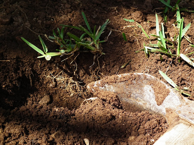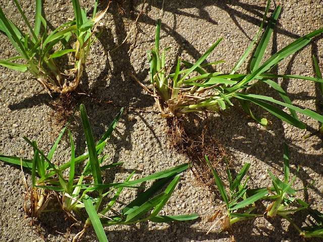 E agora vamos comparar o escalracho (Panicum repens) com a comum relva de jardim, a graminha Santo Agostinho (Stenotaphrum Secundatum) e prestar atenção nas diferenças.