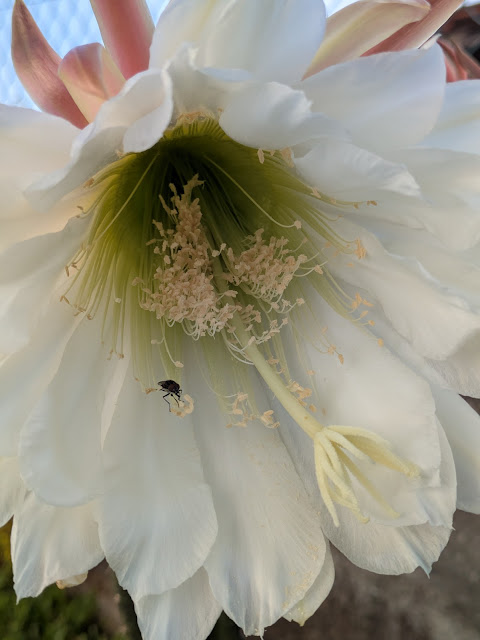 Primeira vez que o cato São Pedro (Trichocereus Pachanoi) dá flor cá em casa. Primeiro começaram a crescer uma espécie de cabelos, até que, cerca de vinte dias depois, abre em todo o seu esplendor. A flor abre de noite e, infelizmente, só dura um dia. Mas vale a pena. E as suas flores, que cheiram muito bem, atraem imensos insetos.