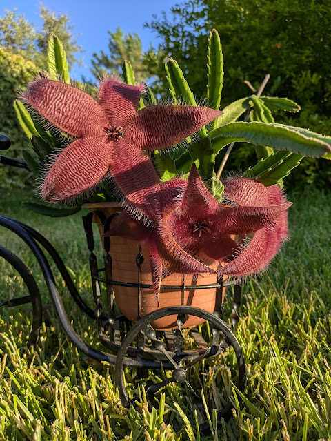 Esta stapelia hirsuta deu uma flor em setembro e outubro dos anos anteriores. Não deixa de ser extremamente curioso que, hoje, dia 29 de Julho, dia do seu aniversário, tinha quatro enormes flores abertas às 7h da manhã.