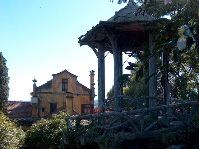 Nas traseiras da casa destaca-se uma estrutura em betão, simulando troncos de árvores, assente em cima de uma gruta e de um pequeno lago.
