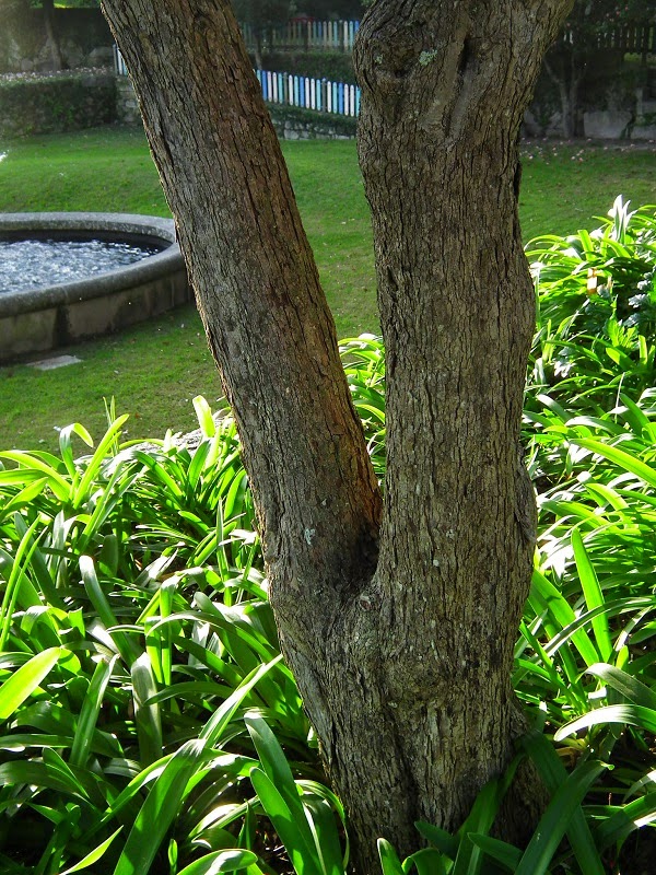 Encontrei também uma árvore que ainda não identifiquei. Tem um tronco bastante atraente, e dá umas bolas um pouco maiores que o azevinho, e mais pequenas que cerejas. Recolhi uns frutos, quem sabe, depois se propaga.