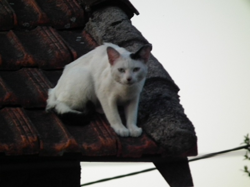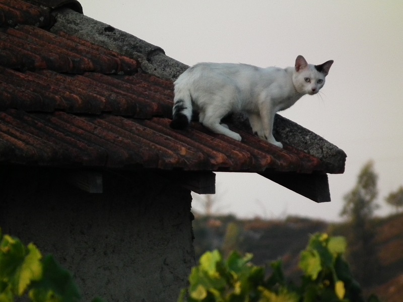 Domingo, o sol já se estava a pôr, eu tinha acabado de jantar em casa dos meus pais, até que alguém olha pela janela e repara no gato que se andava a passear pelo telhado da casa vizinha que está abandonada há anos como se deduz facilmente pela ausência de algumas telhas na beirada.
